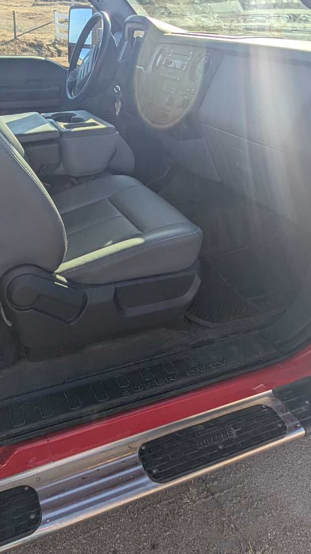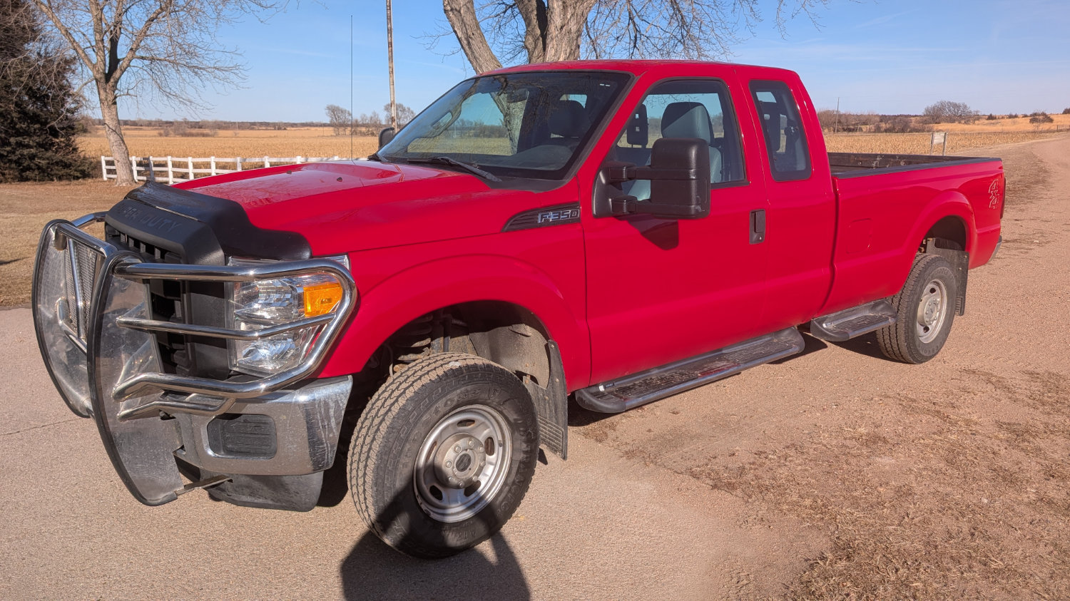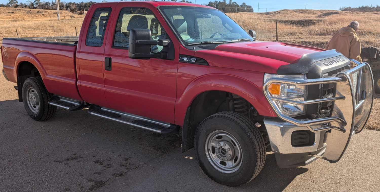 - 2012 Ford Super Duty F-350 Extended Cab 4WD, V8 Gas, Automatic, 46,320 one owner, Red, Front Cattle Guard, 5th wheel ball.